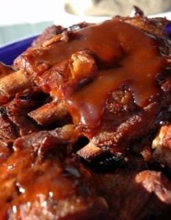 Place ribs curved side up on a preheated medium grill, heat through on one side then flip to heat the other side, brush generously with the BBQ sauce and heat until the edges of the bones begin to bubble.