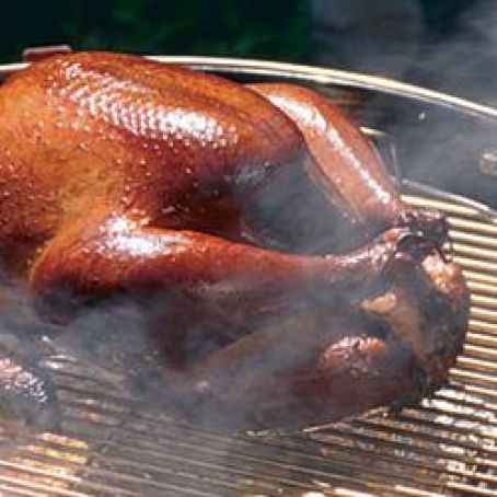 Place the turkey in a deep aluminum roasting pan. Place the pan on the grill's grate. Pour wine over the turkey. Cover the top of the turkey with foil.