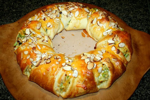 Scoop the turkey mix onto the center of the wide-end seams. Fold the tips of the crescent roll triangles over each other to make a wreath and seal together. When you’re done the crescent rolls should cover the turkey mix completely. Seam together the edges.