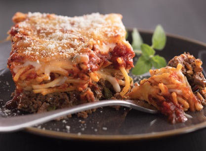 Drain pasta thoroughly (do not rinse). Whisk remaining 2 eggs in medium bowl; stir in 1/2 mozzarella cup cheese until blended. Add pasta; toss to coat. Spread pasta evenly over meat mixture. Pour pasta sauce over top. Sprinkle with remaining 1 1/2 cups mozzarella cheese. Bake 30–35 minutes and until meat is 165°F and fully cooked. Let stand 5 minutes before serving. Sprinkle with Parmesan cheese. Serve.
