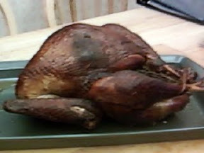 This is the way I prepared the turkey before putting it into the smoker Thanksgiving, 2010. I placed a disposable aluminum pan underneath to catch the drippings for the greatest smoked turkey gravy. I've since learned to line the pan with aluminum foil, but not let the aluminum touch the bottom of the pan, so it doesn't dry up.