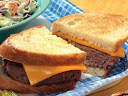 3.To assemble sandwiches, spread margarine on one side of each bread slice. With margarine on outside of sandwiches, assemble 4 sandwiches with cheese slices and ground beef patties.