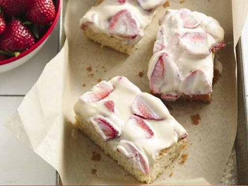 3 In large bowl, mix sour cream and brown sugar until well blended. Gently stir in strawberries. Spread topping over warm cake. Store in refrigerator.