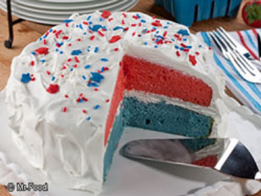 2.Divide batter evenly between 2 bowls. Stir red food coloring into one bowl of batter, and blue food coloring into second bowl. Pour each bowl of cake batter into an 8" round cake pan.
