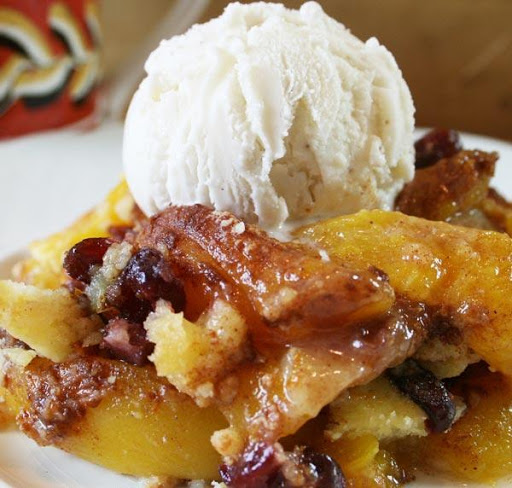 Spread melted butter in a 13”x9” baking pan; set aside. In a large bowl, combine dry bread mix, reserved peach syrup, egg and one tablespoon orange zest. Stir until moistened. Drop batter by heaping spoonfuls over melted butter; spread slightly without stirring. Arrange peaches over batter; sprinkle with cranberries. In a small bowl, combine sugar, remaining zest and cinnamon; mix well and sprinkle over fruit. Bake at 375 degrees for 50 to 60 minutes, until edges are deeply golden . Cool slightly; dollop individual servings with whipped cream or ice cream.