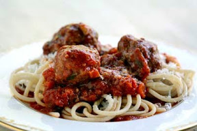 To serve, place thin layer of sauce on plate, add pasta, add sauce and meatballs, sprinkle with grated parmesan-romano cheese.