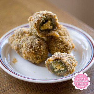 Cut around the stems and hollow out peppers. Stuff peppers with cheese. Set aside. Mix together raw sausage, Bisquick and any remaining cheese. Make thin patties and roll around stuffed peppers, covering completely. Dip peppers into 2 beaten eggs and then roll peppers in Oven Fry. Place on a cookie sheet and bake at 325 degrees for 35 minutes or until golden brown. Serve hot.
