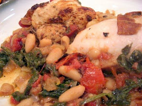 3. Add onion and 1/8 teaspoon salt to pan; reduce heat to medium, and cook 5 minutes or until onion begins to brown. Stir in bacon, spinach, rosemary, beans, and tomatoes; remove from heat. Arrange chicken pieces on top; bake, uncovered, at 350° for 40 minutes. Discard skin before serving.