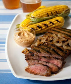 3. Remove butter from refrigerator. Heat outdoor grill or stove top grill pan. Remove meat from marinade. Grill 2 to 3 minutes per side for medium-rare. Serve with seasoned butter and with grilled corn and onions, if desired.