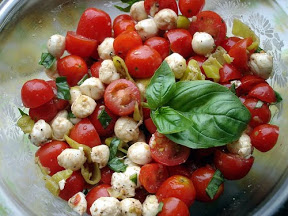 Slice basil leaves thinly and slice mozarella balls in half. Toss all ingredients together