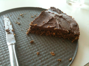 Combine first 6 ingredients (through coconut oil) in large bowl and mix until combined. The mixture will be crumbly, but should hold together when pressed. Scrape mixture into pan (I used a nonstick springform pan as that’s what was in the beach house, and I was going for a birthday cake look. The original recipe suggests an 8 inch square lined with parchment. Press mixture down evenly.
