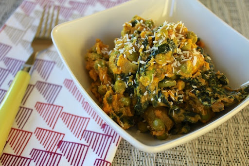 2. Add no-salt seasoning and turmeric to the mixture and stir to combine. Add the tomato, peas, baked sweet potato and beans to the pot, along with about a ½ cup of water if mixture is dry. Stir to combine.