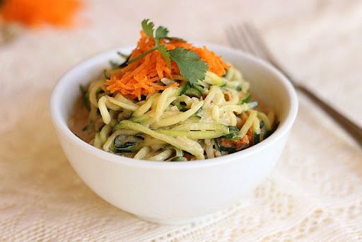 For the zucchini noodles, I like to spiralize them, sprinkle them with salt and leave them in a sieve for about 10 minutes. Then, a put them in a dish towel in squeeze out the excess water. They become a bit more limp and ‘noodle-like’ when I do this, but you can eat them either way.