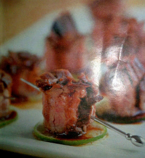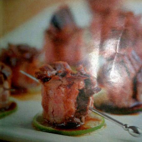 4. Roll each strip of beef lengthwise into a bundle and spear