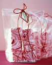 Give out homemade treats that are great in hot cocoa — or straight from the bag. Peppermint marshmallows are easy to make; they get their red swirl from a quick marbleizing technique. Follow our recipe, then package them in small cellophane bags to show off their good looks. Fold the top of each bag over once, and staple it shut. Use a small hole punch on either side of the staple. Thread a length of red twine through the holes, and knot it in front. Pull one end through a gift tag, and finish with a bow.