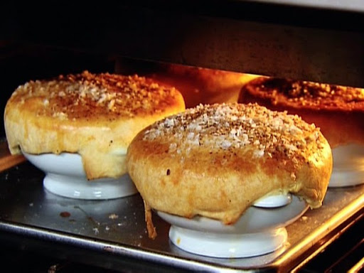 Divide the filling equally among 4 ovenproof bowls. Divide the dough into quarters and roll each piece into an 8-inch circle. Brush the outside edges of each bowl with the egg wash, then place the dough on top. Trim the circle to 1/2-inch larger than the top of the bowl. Crimp the dough to fold over the side, pressing it to make it stick. Brush the dough with egg wash and make 3 slits in the top. Sprinkle with sea salt and cracked pepper. Place on a baking sheet and bake for 1 hour, or until the top is golden brown and the filling is bubbling hot.
