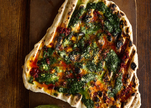 - Ancho Chile Oil, Green Charmoula, and grated Cotija or Parmesan cheese