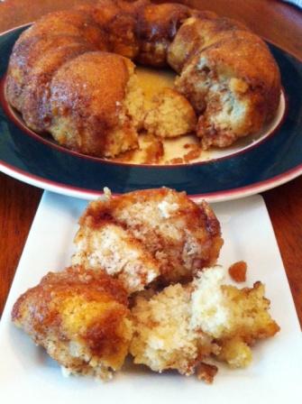 With moistened hands, scoop dough in Tablespoon portions, roll gently into ball shape (not perfect rounds, just until smooth and formed), give each dough ball a good coating with the cinnamon sugar mixture, then place each in the prepared pan. You will make a complete circle in the bottom of the pan, then begin again with an inner, then an outer circle of coated balls of dough. No need to press the dough together.