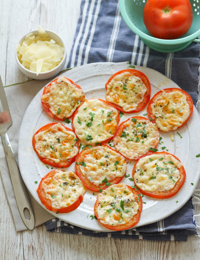 Top each slice with enough parmesan to cover the top, as well as a sprinkling of basil and oregano.