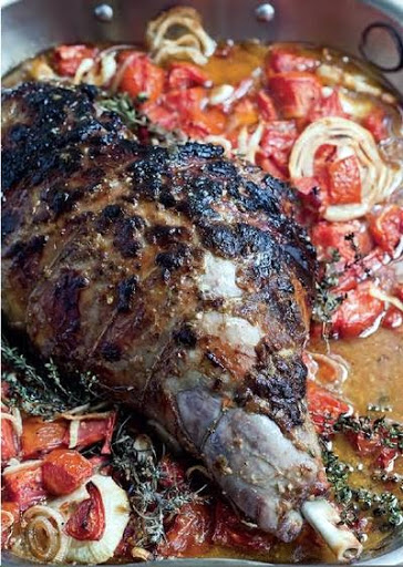Slice the lamb, arrange on a platter, sprinkle with salt and pepper, and serve with the tomatoes and pan juices spooned on top.