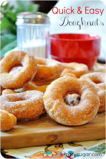 Meanwhile, combine sugar and cinnamon in a large bowl. Dip warm doughnuts in sugar and cinnamon, and enjoy!
