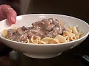 Season the steak strips with House Seasoning, then dust with flour. In a large skillet, quickly brown them on both sides in the olive oil and butter. Remove the steak from the pan. Add the onion slices and mushrooms to the pan drippings. Saute for a few minutes, until the onion is tender. Sprinkle with 1 teaspoon flour. Put the steak back into the pan with the onion and mushrooms. Add the mushroom soup and beef broth. Cook over low heat for about 30 minutes, covered. Adjust seasoning to taste, adding salt and pepper, as needed. Stir in the sour cream the last few minutes, right before you serve. Serve over cooked noodles.