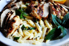 Pour pasta and sauce into a large serving bowl. Sprinkle remaining basil all over the top, then add sliced chicken breasts. Serve immediately!