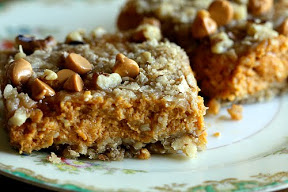 RESERVE 1 cup oat mixture; press remaining onto bottom of prepared pan. Bake 15 min. Beat cream cheese, remaining sugar, eggs, vanilla, bourbon, pumpkin and spice with mixer until well blended. Pour over crust; sprinkle with reserved crumb mixture and a handful of butterscotch or chocolate chips (if desired).