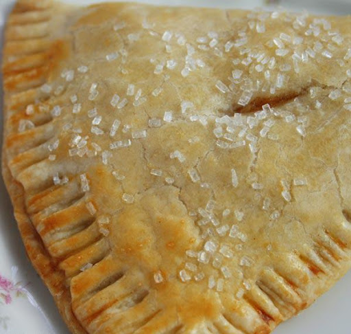 Melt butter in a skillet over medium heat. Combine cornstarch with 1/3 cup sugar; add to skillet. Stir in peaches, cinnamon and salt. Cook until mixture thickens and boils, about 25 minutes, stirring frequently. Boil for one minute; remove from heat and stir in lemon juice. Cool completely; set aside. Cut crusts into quarters; spoon 2 tablespoons filling into the center of each quarter, leaving 3/4-inch dough uncovered on each side. Fold dough over filling; press edges together to seal. Transfer pies to 2 ungreased baking sheets. Brush tops of pies with egg; sprinkle with remaining sugar. Cut a one-inch slit in the top of each pie.