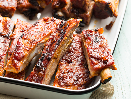 Baked ribs can also be finished in the broiler. Line a broiler pan with foil, then arrange the slabs, bone side down, on the pan and brush the fat-covered side with barbecue sauce. Broil, 3 to 4 inches from the heat, until the sauce on the fat-covered side begins to caramelize and lightly char, 2 to 3 minutes. Flip the slab, brush the bone side with barbecue sauce, and continue to broil until the sauce on the bone-covered side begins to caramelize and lightly char, 2 to 3 minutes.