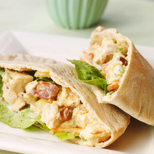 Line each pita half with 1 lettuce leaf; fill each half with 1/3 cup chicken mixture.