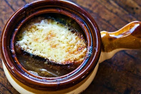 The trick to a great French onion soup is starting with good stock. French onion soup is usually made with beef stock. I've made delicious soup with stock from the leftover rib and chine bones of a rib roast. Another important element is the proper caramelization of the onions. Caramelizing onions take at least thirty minutes of slow cooking the onions over medium high heat. The browning, or caramelizing, of the onions brings out the sweetness in them.
