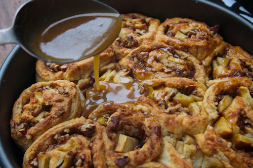4. Turn dough out onto a lightly floured surface, and cut into 6 equal portions. Roll out 1 portion of dough into a 7x12 inch rectangle, keeping remaining dough covered with a damp towel. Spread 3 tablespoons butter over rectangle, and sprinkle with 1/3 cup loosely packed brown sugar mixture, 1/3 cup chopped apple, and 2 tablespoons pecans. Starting at a long side, roll up dough, jelly roll fashion, and pinch seam to seal. cut crosswise into 8 pieces. Repeat procedure with remaining dough portions.
