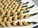 2. Wrap 1 pastry strip around each asparagus spear, prosciutto-side in. Place the pastries seam-side down onto 2 baking sheets.