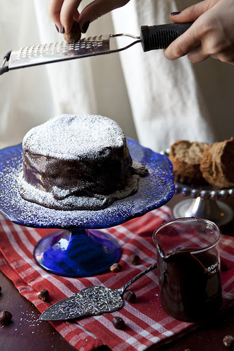 6. As cake cools, double broil chocolate with vanilla. Stir mixture as the chocolate melts. Remove from stove and let cool. To serve, drizzle or cover entire cake with chocolate ganache. Top with dusting of powdered sugar and freshly grated nutmeg.