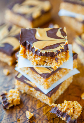To create the marbled pattern, drizzle peanut butter over the chocolate in 5 wide, evenly spaced, parallel lines, each spanning the width of the pan. Like 5 rows of long train tracks.
