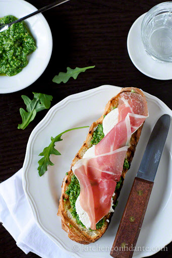 * *Mix* the pesto with the oil and spread randomly in dollops over the toasted bread. *Top* each half-slice with a piece of prosciutto.