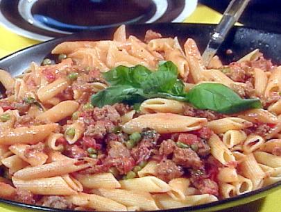 Heat a large, deep skillet over medium high heat. Add extra-virgin olive oil, 1 turn of the pan. Add sausage meat. Crumble sausage meat as it browns. Add chopped garlic to the pan. When all of the crumbles have browned evenly, deglaze the pan drippings using chicken or vegetable broth. Stir in crushed tomatoes and bring the sauce up to a bubble, then reduce the heat to a simmer. Stir cream into your sauce, this will blush the color and cut the acidity of the tomatoes. Season with salt and pepper. Stir peas and basil into your sauce to combine. Toss hot drained penne rigate in pan with the sauce, then transfer pasta to serving bowl.