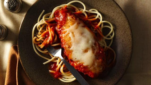3. In 12-inch skillet, heat 2 tablespoons vegetable oil over medium-high heat. Stir in garlic; cook until garlic starts to brown. Add chicken breasts; cook 6 to 10 minutes, turning once, until browned. Pour cooking sauce around chicken; sprinkle chicken with remaining bread crumb mixture and mozzarella cheese. Heat to boiling. Cover; reduce heat to medium. Cook 5 to 8 minutes or until juice of chicken is clear when center of thickest part is cut (at least 165°F) and cheese is melted. Serve with spaghetti.