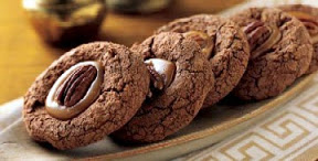 Drop by rounded tablespoonfuls, 1-inch apart, onto an ungreased baking sheet. With thumb or handle of wooden spoon, press indentation into center of cookie dough and fill with caramel. Place 1 pecan half on top of caramel.