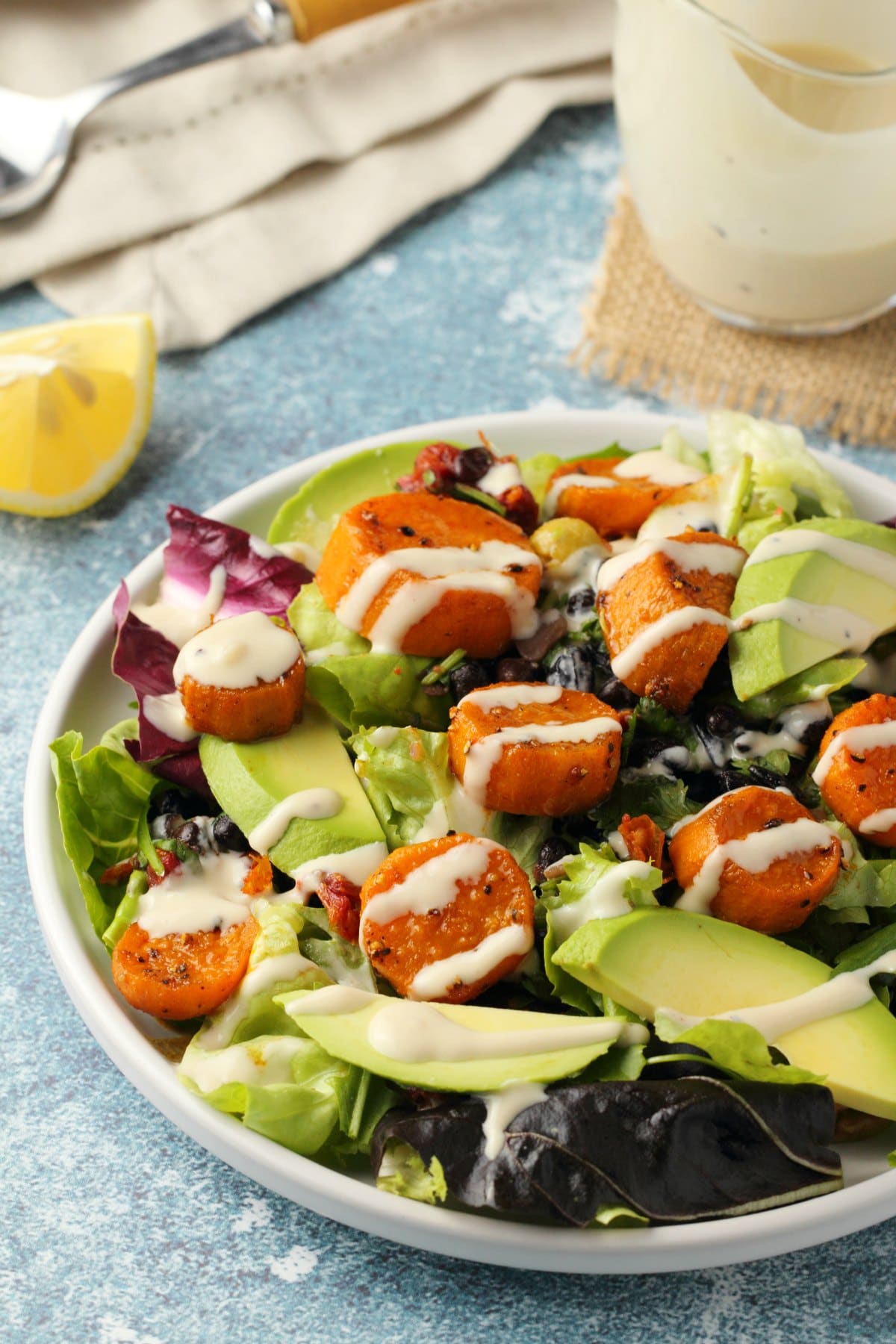 Fresh and colorful vegan sweet potato salad topped with a delicious tahini dressing. This salad isn’t a side dish it’s the main event! Filling and satisfying.