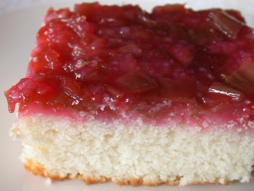 Mix a white or yellow cake mix as directed and pour over the rhubarb mixture.