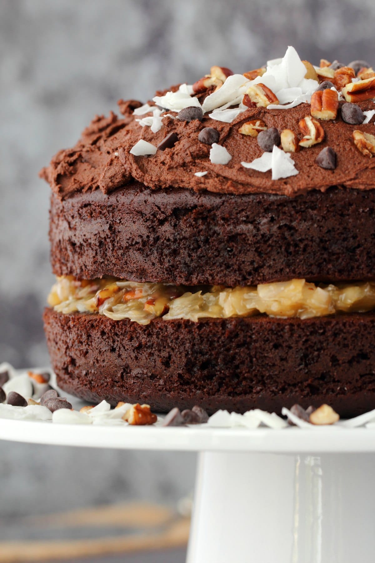 Moist and rich 2-layer vegan German chocolate cake with a coconut pecan filling and a chocolate buttercream frosting. Mega-chocolatey and ultimately delicious!
