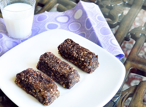 Blend all the ingredients, using a food processor or Magic Bullet. No need to blend the dates first; I just blend everything all at once in my MB. If you use drier dates than SunMaid, you might have to add up to 1 tbsp water. Form into bars. It might help to put dough in a plastic bag and close the bag, then shape into a bar. (Feel free to experiment with different nut combinations. I often sub almonds or cashews for some of the walnuts.)