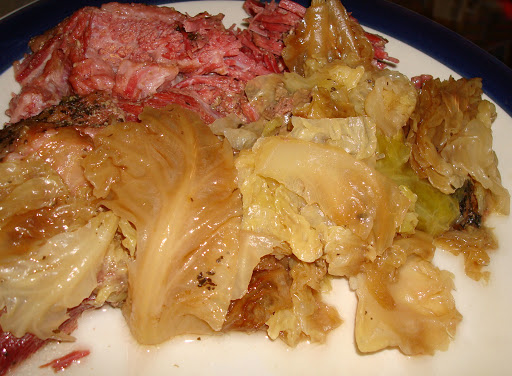 Place the corned beef (*fat side up*) in a large Crock pot with the juice and spices. Add two cans of beef broth, water, and basil. Cook the corned beef on HIGH for 3 hours. Add 1/4 of the head of cabbage to the Crock pot. Remove 1 cup of the juice from the Crock pot and place the juice in a large pot. Add 1/2 of the cabbage head to the large pot of juice and add one can of beef broth to the pot. Cook the corned beef for an additional 3 hours. Add carrots to the pot and cook the cabbage and carrots for 1 - 2 hours on LOW-MEDIUM heat. Serve the cabbage with the corned beef.