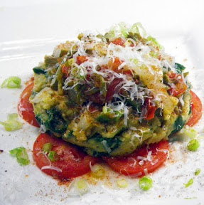 And, just make a bed of the raw tomato slices, add half the green onions. Add about a cup of the polenta, top with a cup of the Sautéed Vegetable Melange. Top with some grated cheese and a pinch of the Cajun spices.