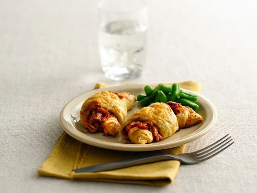 2) In bowl, mix chicken and barbecue sauce. Spoon chicken mixture onto short end of each triangle; sprinkle each with 1 teaspoon of the cheese. Roll up loosely as directed on can. Place on ungreased cookie sheet. Brush with egg; sprinkle with remaining cheese.