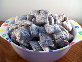 In a microwave safe bowl, microwave chocolate chips, peanut butter, & butter on high for 1 minute. Stir. Microwave about 30 second or until mixture can be stirred smooth. Stir in vanilla. Pour mixture over cereal stirring until evenly coated. Pour into 2-gallon resealable food storage plastic bag.