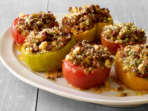 3. Place the basil, cheese and celery leaves in the food processor and chop. Sprinkle onto the tomatoes. Put on the tomato tops, cut side down, between the stuffed tomatoes. Bake until the stuffing is golden, about 20 minutes. Cover each tomato with a top and serve with the sauce.
