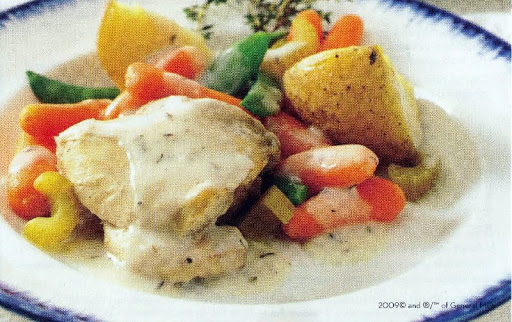 Remmove chicken and vegetables from cooker to serving bowl, using slotted spoon; cover to keep warm. Increase heat setting to high. In small bowl, mix whipping cream, flour and 1 tsp. thyme; stir into liquid in cooker. Cover; cook about 10 minutes or until thickened. Pour sauce over chicken and vegetables.